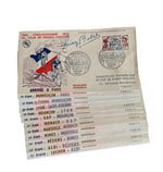 Série complète de 23 cartes postales du Tour de France du Cinquantenaire 1953 avec cachets d'étape illustrés, signatures incluant la Belgique et Monaco.