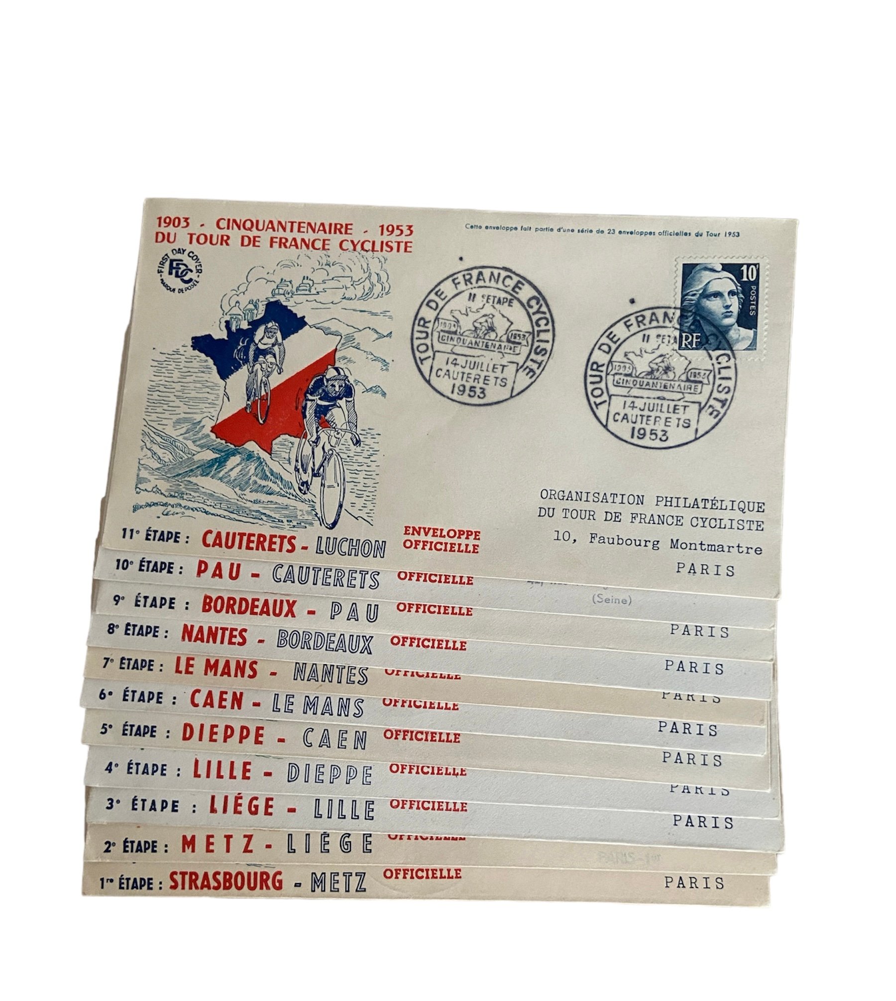 In 1948, for the first time, the Tour de France was issued with a special postmark for each of its stages on French territory - a total of eighteen postmarks, a novelty in the history of temporary cancellations. Foret requested a date and place stamp from the French Post Office. Designed by artist Maurice Tranchant, the cachet remained the same for each stage, only the name of the town and the date changed; special "Tour de France" letterboxes were placed in the finish area and at the Tour headquarters in each town, so collectors could be happy!