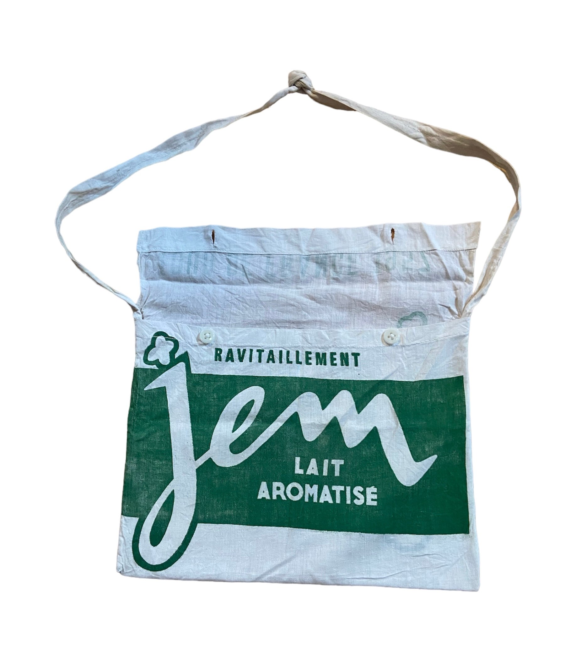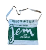 Supply bag for the 1957 Tour de France won by Jacques Anquetil. Jem advertising.
