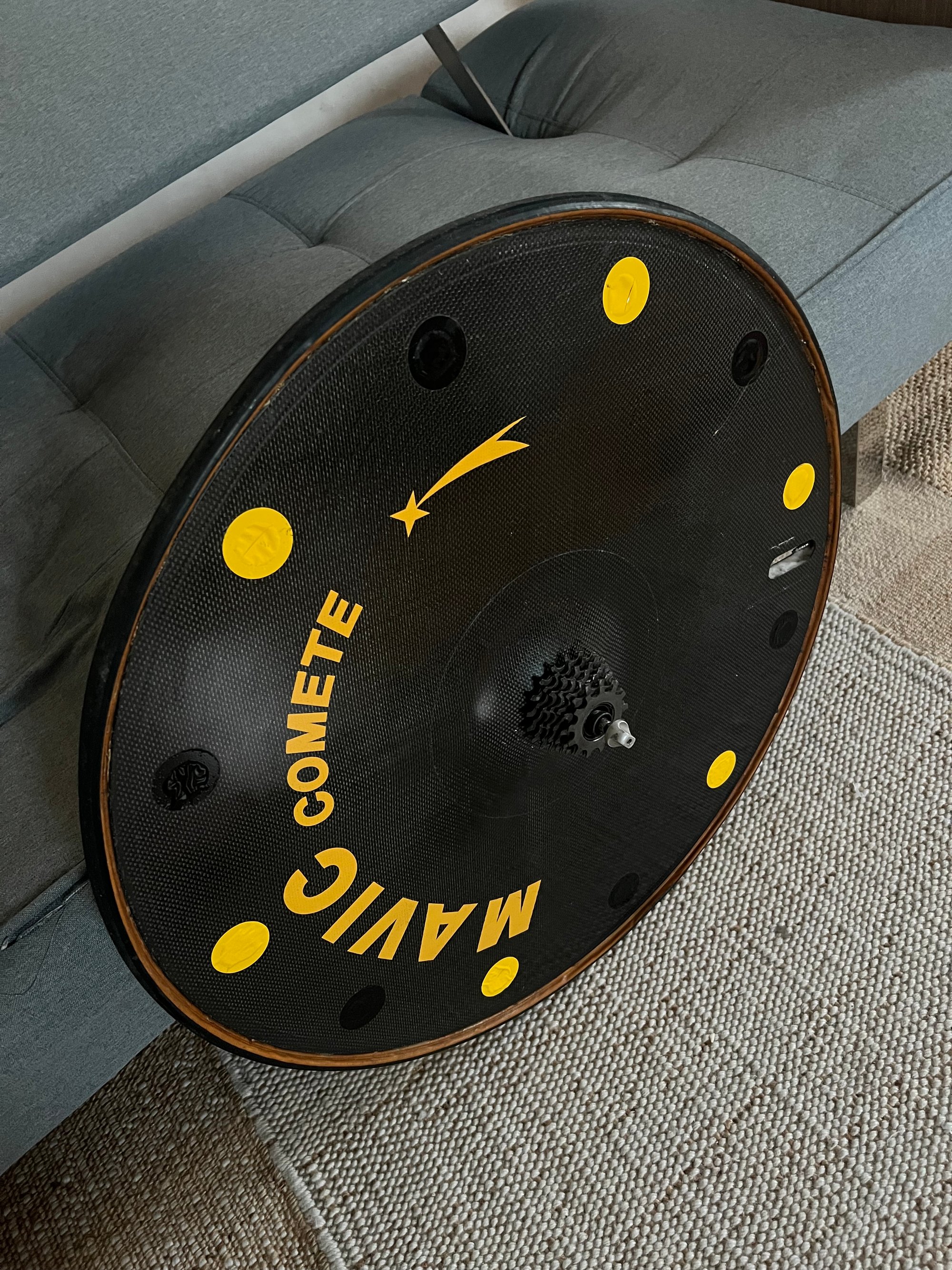 Mavic jumped at the opportunity, and it didn't take long—just one year—to release the Comète wheel in 1985, after wind tunnel testing at Saint-Cyr l'Ecole. Far from being a flash in the pan, this paracular wheel is still part of the arsenal of those who want to ride fast on the track, 35 years later. The first carbon model is even 200 grams lighter than the one used by Francesco Moser in Mexico City in 1984.