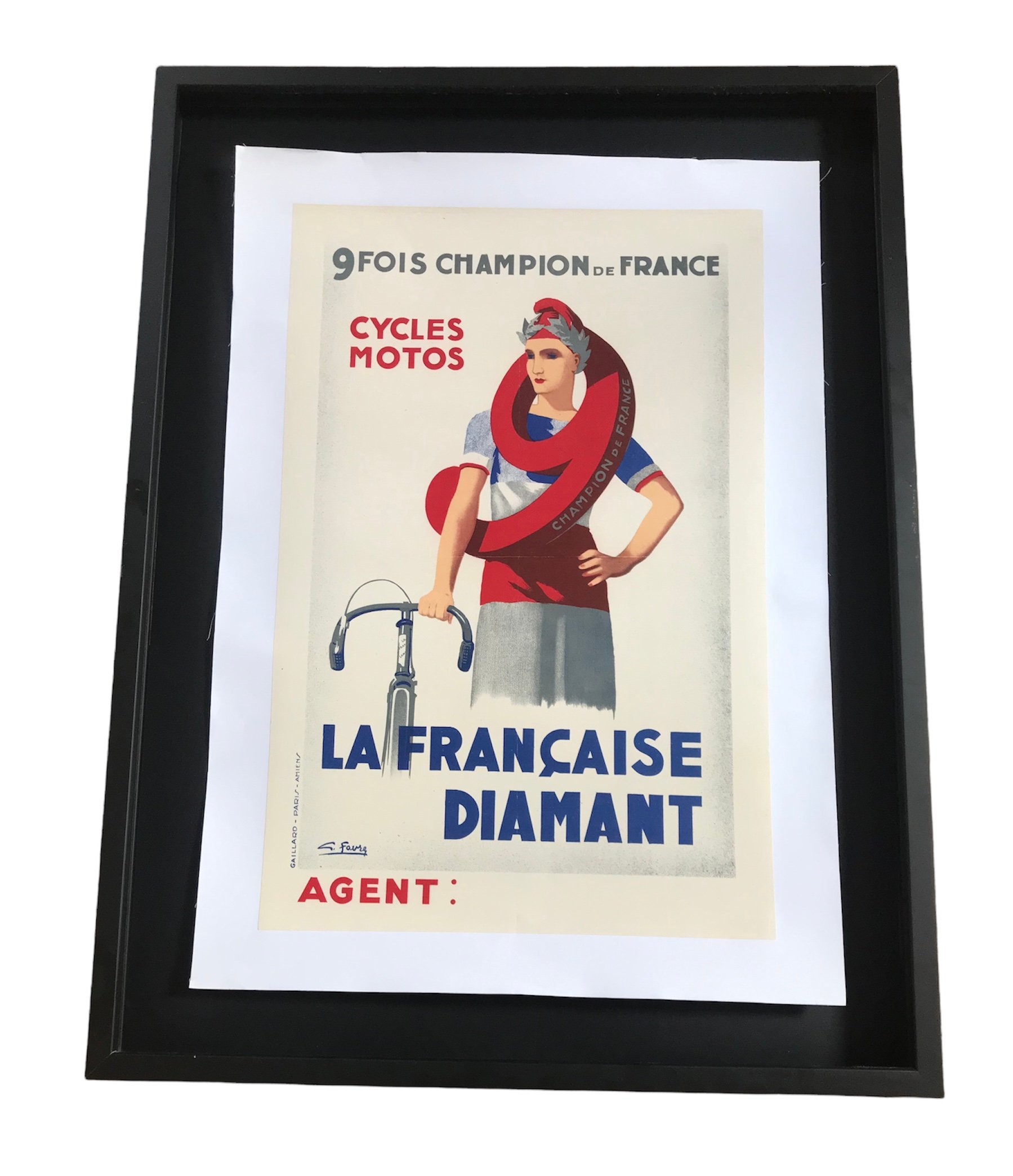 This gorgeous advertising poster for the French brand "La Française Diamant" shows a woman cyclist with the number 9 draped around her neck. This refers both to the text at the top of the poster which reads '9 Fois Champion de France' (9 times French champion) and to a common practice of professional cyclists who sometimes wear an inner tube around their neck.